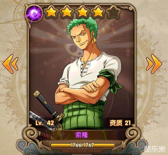 草帽海贼团副船长、剑士,要带上佩三把刀,自称三刀流剑客,欲成为世界第一剑客