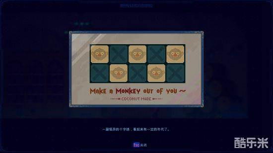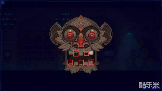 然后交互左边墙上的猴子面具,出现小游戏。这个游戏需要我们把猴子的牙齿按下,参照刚才看到的十字绣,把带叉的对应的牙齿按下去。