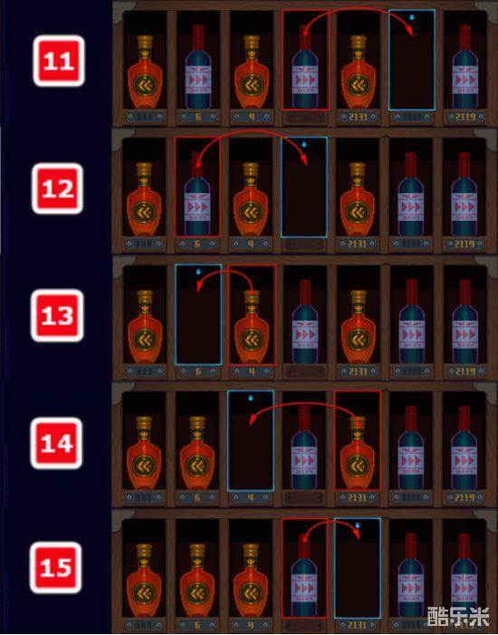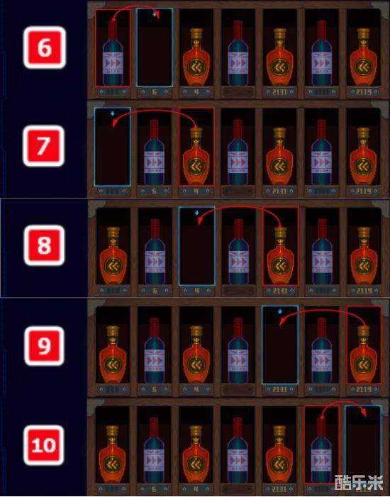 然后就要进行酒瓶换位的小游戏,需要我们把左边的蓝色酒瓶和右边的红色酒瓶的位置掉个个儿。整体是跳棋的玩法,即点击瓶子后,会跳入身边的空格,或者跳入隔一个瓶子的空格。解谜跳法如下图,以标注的数字顺序为步骤,依照箭头的指引移动瓶子。