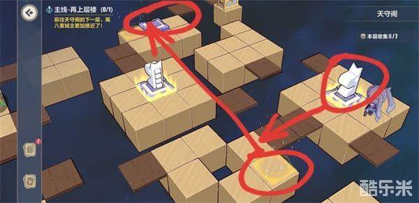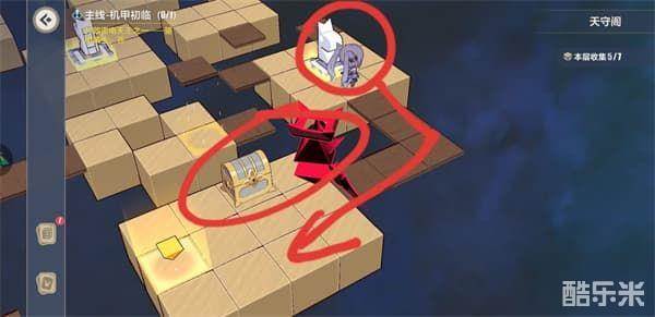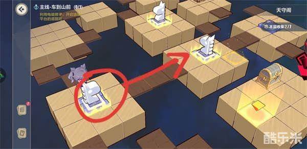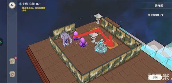 走进去后开启了谜题,首先按图示路径把上方的矿石推到下方的格子里。
