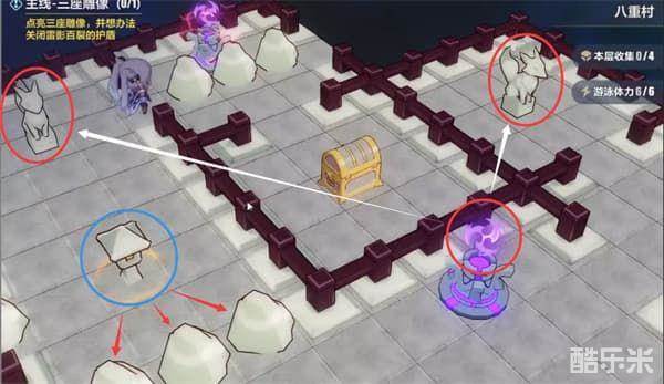 按照如图所示的顺序和路灯互动,五步结束后是这个效果,这样我们就可以拿到上面的两个雷元素了,再把开门用的雷元素还回去,打开石头后击败boss皮皮马即可进入下一层。