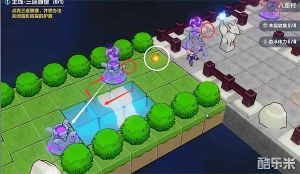 接下来是本关是树莓和全收集,刚刚点亮全部神像后顺带就把雷元素放在图中1号充电桩处,打开左边的区域。(1号和2号的命名我们稍后会用到)树莓别忘了,拿取2号充电桩上的雷元素需要注意按照图中红色箭头走,不能带着雷元素下水,否则会重来。