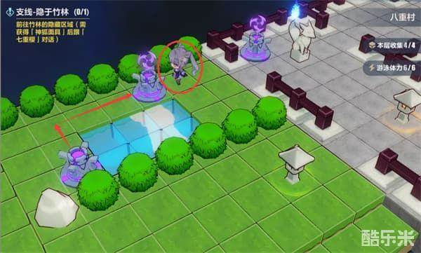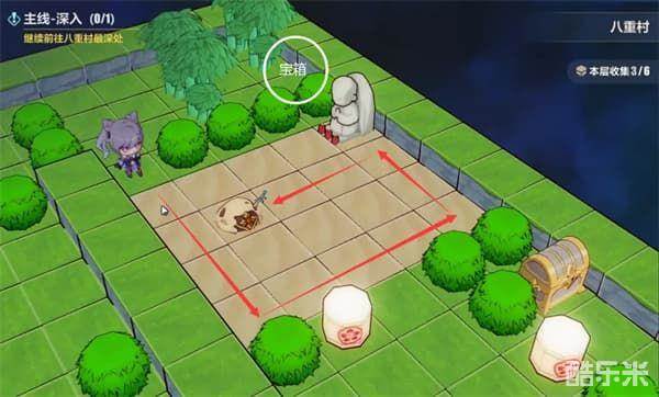 砍掉竹子可以拿一个宝箱,沿箭头走顺路和神像遗迹守卫都互动一下,神像说的话就是灯笼的互动顺序,这里直接标出来了。
