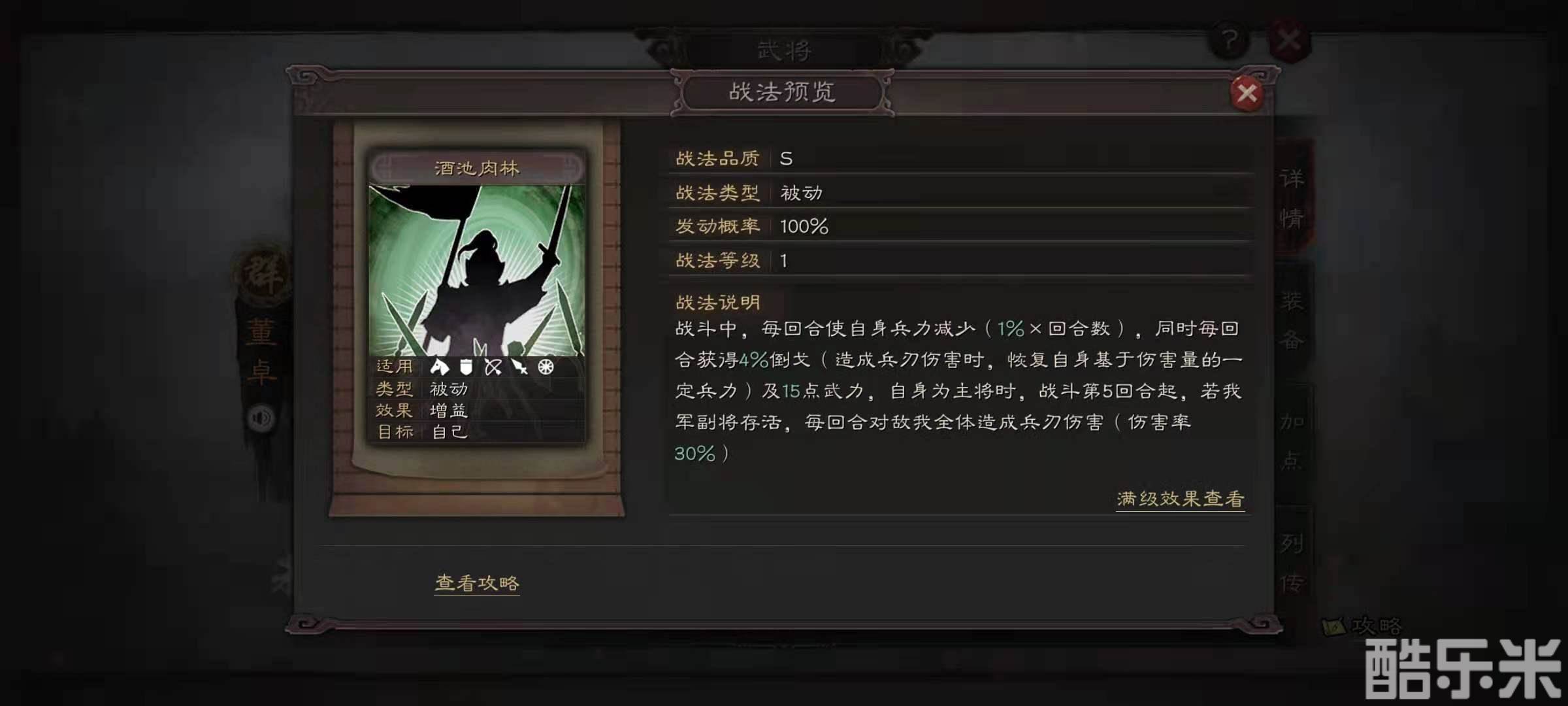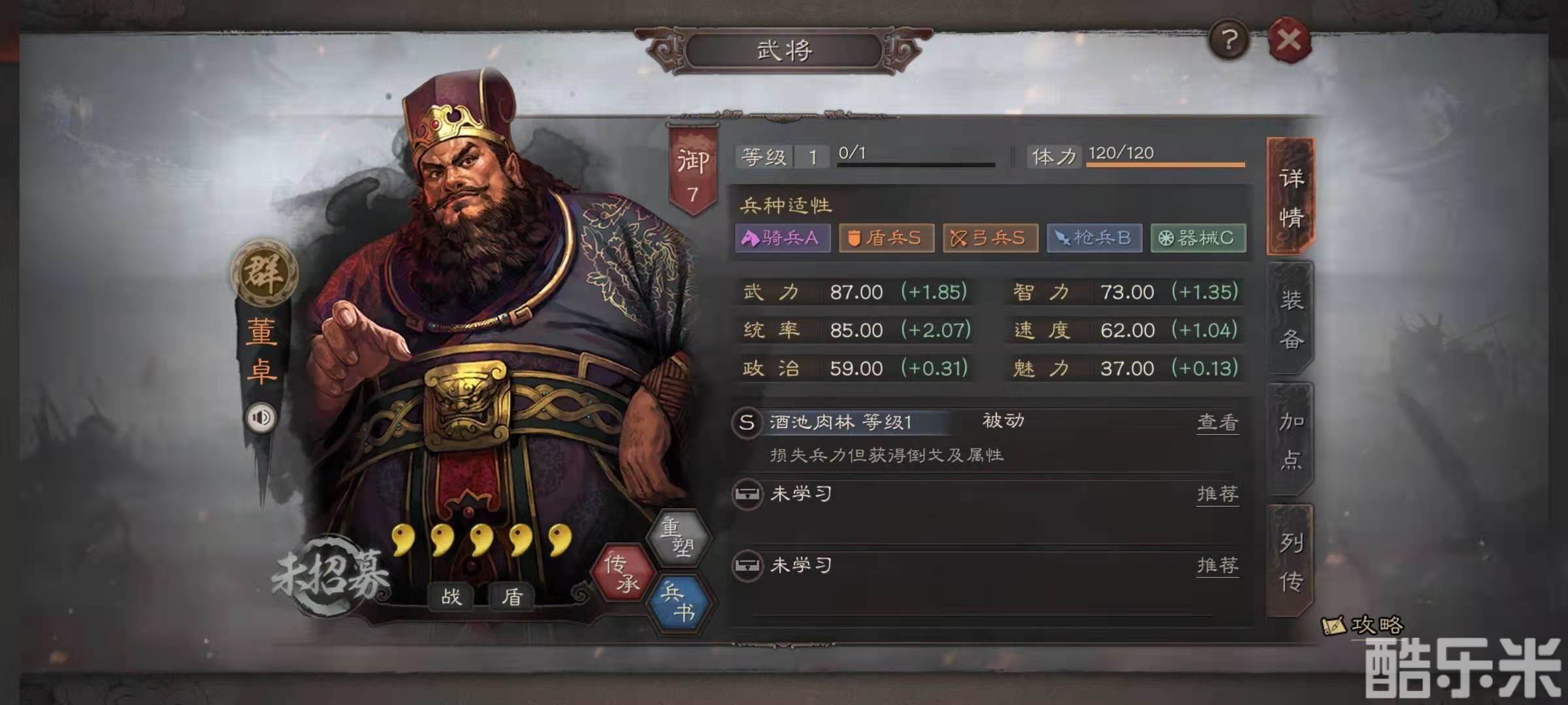 董卓面板属性武力初始87点,统率值初始85点,属于比较均衡的武将,自带战法酒池肉林,效果是每回合自动损失兵力,但是可以获得倒戈属性,造成伤害的时候可以吸收敌方损失的兵力,并且恢复自身兵力,如果董卓是主将,在战斗的第五个回合,如果还有副将存活的话,董卓会对敌方和己方造成无差别的兵刃伤害。