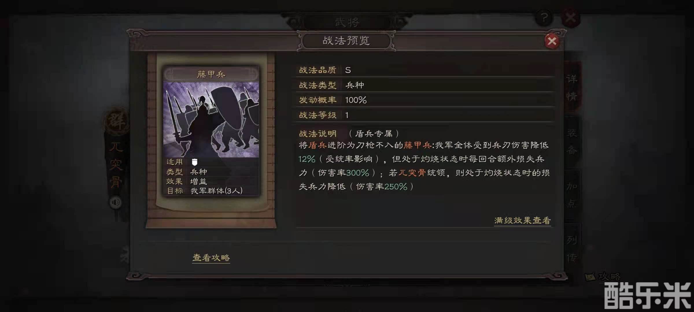 三国志战略版力求还原最真实的三国,在特殊兵种的打造上也是不留余力,完全按照历史事实来进行设计,藤甲兵的特点就是使得盾兵进阶为藤甲兵,在战斗中全体受到的兵刃伤害降低24%(最大数值),但是遇到灼烧技能的话,每个回合会额外损失300%的兵力值,如果是兀突骨率领的话,则降低一些受到灼烧的伤害。藤甲兵获得的方式是兀突骨进行传承来获得。