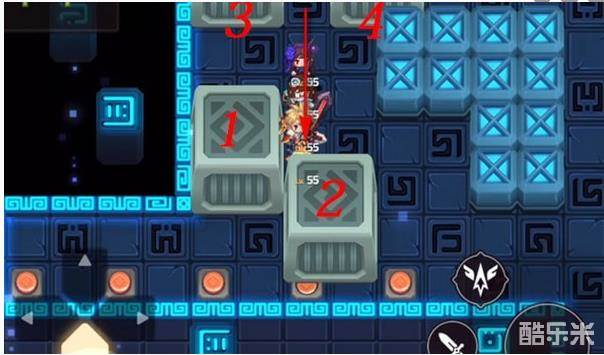 首先将第一个箱子直接往前推到最里面,压住按钮;