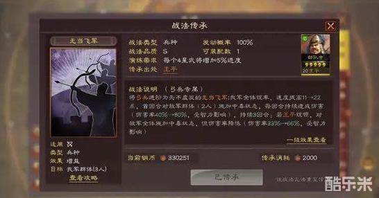随后是作为输出的庞统,其自带主动战法可以准备一回合,随后对敌方全体施加铁索连环,使其任一目标受到伤害时会有15%概率(受智力影响)反馈给其他单位,持续两回合,并发动谋略伤害,输出上限十分高。配合太平道法的提高自身28%奇谋和6%(若为准备战法则为12%,受智力影响)自带主动战法发动率,可以极大地增加队伍的输出上限和输出稳定性。无当飞军可以提高我军全体统率、速度22点,并在首回合对敌军群体施加中毒状态,每回合持续造成伤害(受智力影响),持续三回合,在稍微增加队伍身板硬度的同时也能为队伍提供一些稳定的法术伤害。