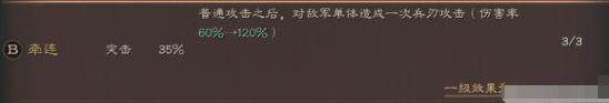 该段效果十分简单粗暴,让已方全体获得一个普攻后35%几率触发额外单体兵刃伤害的特性。虽然没有明说,但懂的人都知道这其实就是一个伤害为122%的突击战法,差不多就是B级战法【牵连】的水平。伤害不高,但重点是全体享有。