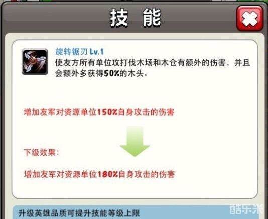 【英雄技能】旋转锯刃:使友方所有单位攻打伐木场和木仓有额外的伤害,并且会额外多获得50%的木头。