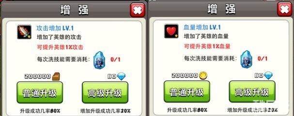 【强化成功几率】给英雄加黄点的方式分为“普通升级”和“高级升级”。