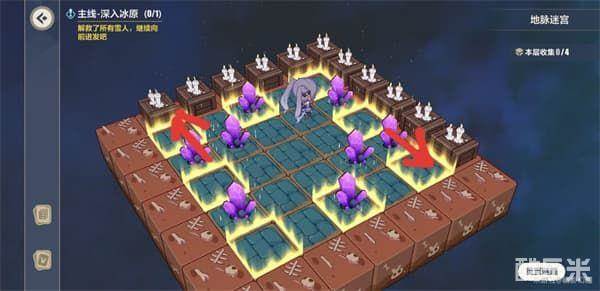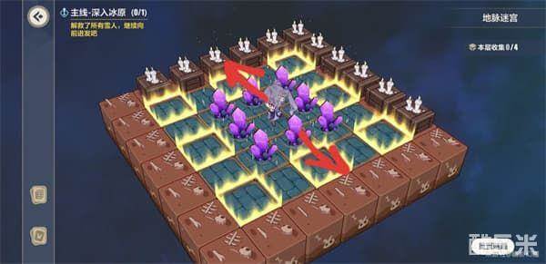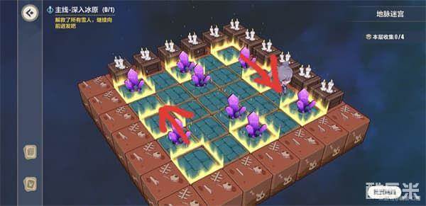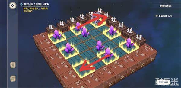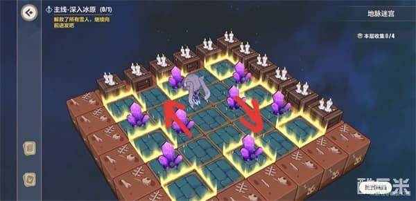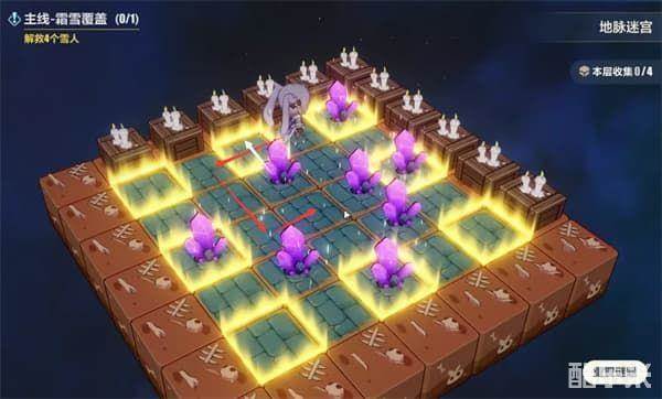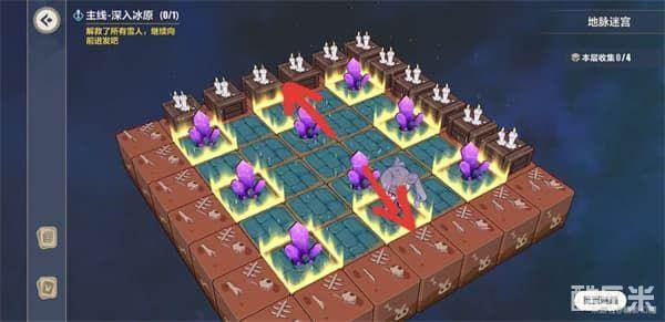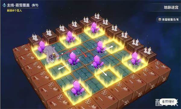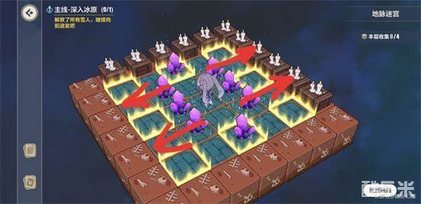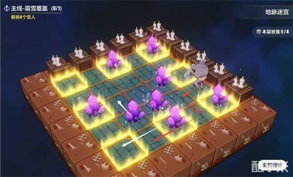 进入雪人身后的地脉迷宫,我们一共七步就可以解开这个推箱子的谜题,这里要注意的是,下面我会用白色箭头标识晶体的移动路线,红色箭头标识人物的移动路线,各位注意跟着我的步骤走。