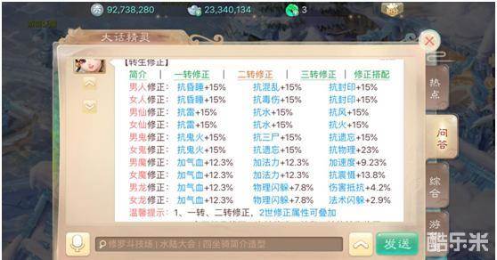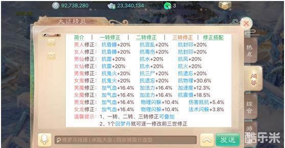 我们可以看到各种族三个转身阶段的修正。选择血法仙综上所述修正来看,三世都选择女魔修正是一个不错的选择。敏不够的情况下可以选择一世男魔的修正来提升速度。如果说全法仙的话,个人感觉还是根据自身抗性缺陷来选择修正的好,比如说队伍敏序对仙的输出为350或者以下是完全没有必要选择男魔女魔修正的。可以混搭人族仙族鬼族修正来提升自身的抗性。三世男人修正叠加后混封印昏睡抗性都在45,三世男仙修正风雷水抗性也都在45对于抗性提升有很大的帮助。当然也可根据自身抗性来调整修正。两世仙一世人等等。