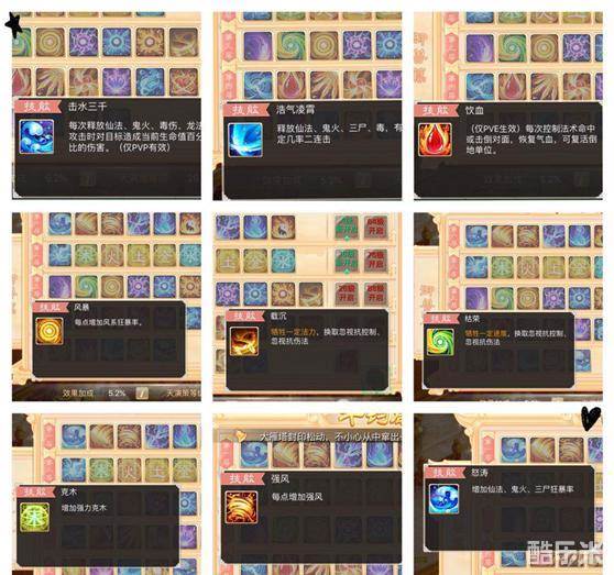 天演册:套装说完咱们说说天演册的一个搭配。综合了一下给大家组合了一套伤害效益比较高同时日常PK通用的一个搭配,大家可以参考一下。注意:载沉和枯荣是可以同时使用的。当然根据各位的五行克不同强法不同,可以把下边的克木和强风法,风法狂暴更改为自身同属性同克的。