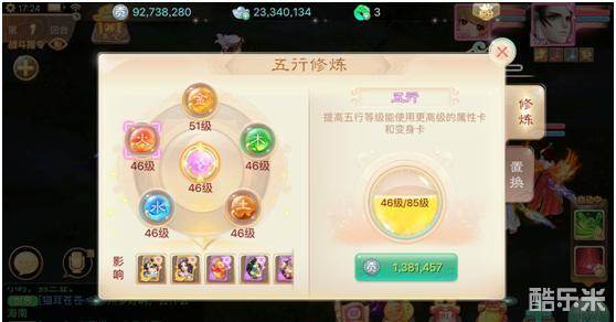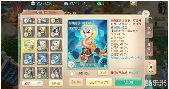 五行修炼:五行修炼影响我们属性卡的变身和选择,作为仙族强力克是增加伤害不可或缺的一部分。所以五行修炼是必修课了。根据自身的强克属性不同,很有必要单一修炼一种五行。五行克相信大家都不陌生,咱们简单说一下,金克木,木克土,土克水,水克火,火克金。强力克木就变金属性的卡,下面咱们看几幅图。