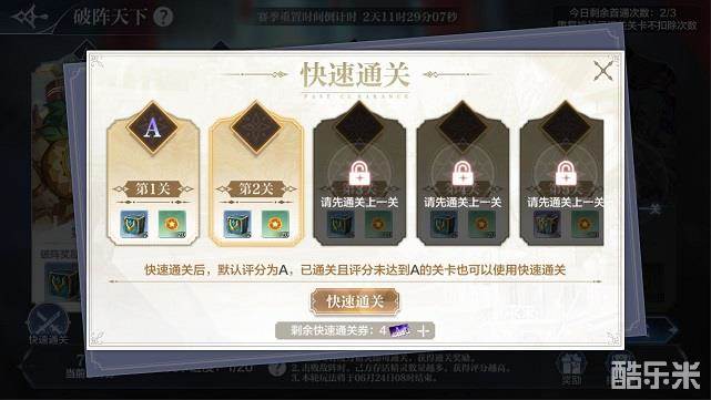 消耗“破阵天下速通券”即可速通破阵天下的关卡,速通后评分直达A级