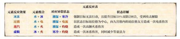 当2种元素状态相叠加时,便有可能产生元素反应,清除原有【元素类状态】,并产生新的【反应类状态】,详情如下:
