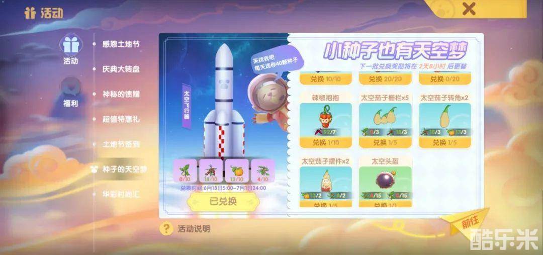 目前第一阶段的核心兑换物品是月球头盔,还没兑换的玩家尽快兑换,要得到变异种子需要大家在成熟前保持在线状态,变异几率会高一些。