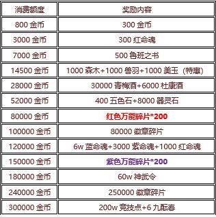 【活动内容】活动期间,游戏内累计消费达到对应金币,即可获得对应奖励;所有商品绝对超值,不信你自己看。相中哪个千万别手软!因为一犹豫也许就不知道何时能再见了。