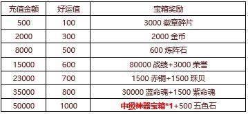 【活动内容】活动期间可通过充值金币获得好运值,积累好运值即可打开宝箱奖励,闪耀称号,全新神器,绝对超值的提升战力资源,尽在特惠好礼。