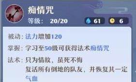 (7)痴情咒,被动增加人物法力,合欢的大招,技能优化后的效果是:复活所有倒地的队友,恢复其一定气血并施加痴情状态施放后自身气血和法力最多保留5%,且使用后不再有冷却CD,痴情状态5回合内无法被痴情咒复活。你品,你细品!因为取消了大招的CD时间(下图是老版技能截图),现在合欢施放大招更自由了,而且合欢施放大招是没有血量要求的。