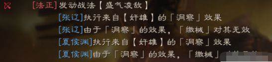 【奸雄】和【无惧】效果生效在盛气发动之前(战斗准备),等到盛气开始生效的时候,战报中会提示【缴械效果对其无效】,就此盛气会彻底失去作用。然而,【决水】的发动时间还要更靠后些(战斗开始),那怕它真的在首回合禁用装备,可能会导致吃到主动战法类控制效果,但【奸雄】和【无惧】也已经完成了他的使命:过渡盛气凌敌。