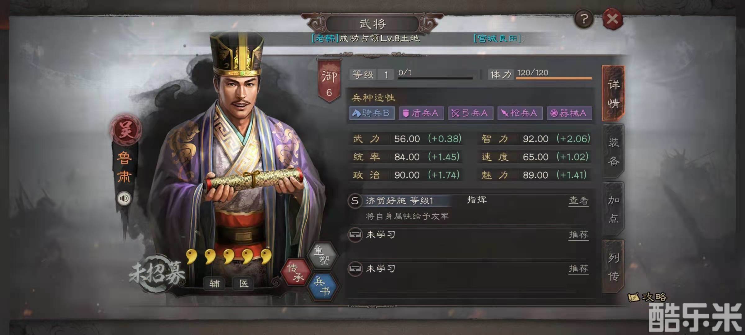 鲁肃战法搭配是白马义从和黄天太平,因为鲁肃可以把自身的属性给与友军,所以自身的伤害可以忽略,只起到辅助作用,黄天太平可以使得敌方进入技穷状态,并且自身进入混乱状态鲁肃才是承载白马义从的最佳选择。