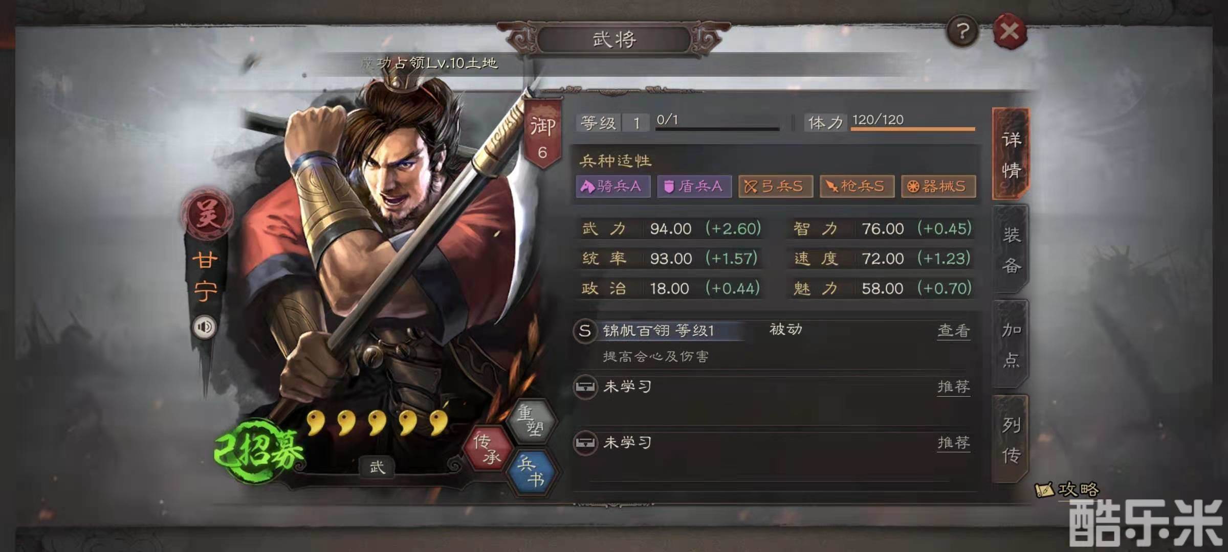 甘宁的自带战法是锦帆百翎,效果是提升甘宁的会心几率和会心伤害,所以甘宁普攻就能获得很高的爆发伤害。另外两个战法选择左右开弓和避实击虚,左右开弓继续提升会心属性,避实击虚可以直接攻击敌方兵力最少的目标。