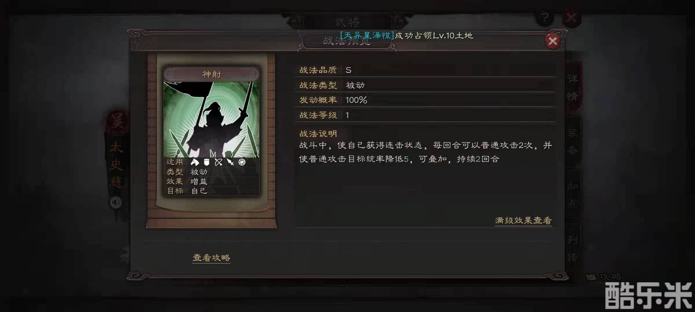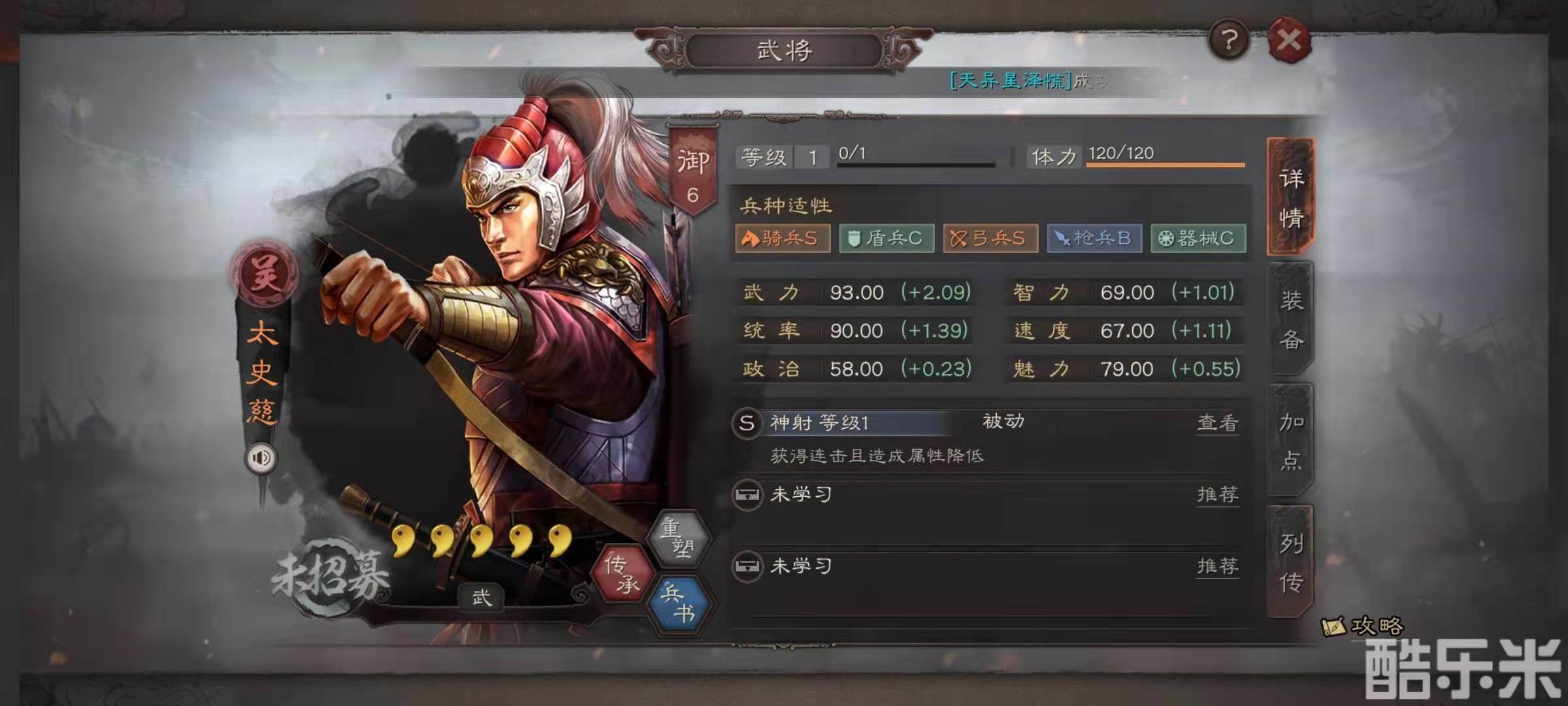太史慈的自带战法是神射,效果是自身获得连击状态,而且普攻可以降低敌方的统帅值,这一套阵容使用的是双输出核心,太史慈就是其中一个,另外两个战法选择弯弓饮羽和折冲御侮,弯弓饮羽的效果是普攻降低敌方的统帅值,折冲御侮的效果是普攻随机降低敌方的统帅值或是智力值,还能使得主将获得抵御效果。