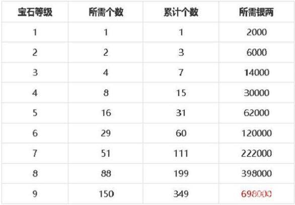 每个宝石初始的价格是2000银子/个,随着人物等级的提升宝石的价格也是会进行提升的,一个宝石升到9级需要将近70万银子。