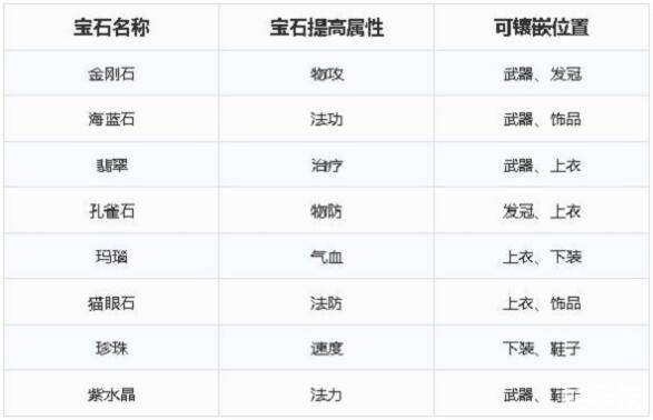 目前游戏中一共有8种不同的宝石:金刚石、海蓝石、翡翠、孔雀石、玛瑙、猫眼石、珍珠、紫水晶,每个宝石都有对应的属性提升,并且不同的宝石能够镶嵌的位置也是不同的。