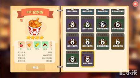 1、游戏在近期与kfc进行了联动活动,在本次的活动中,游戏中也推出了一道全新的食谱,那就是kfc全家桶,这是一道限时菜谱;