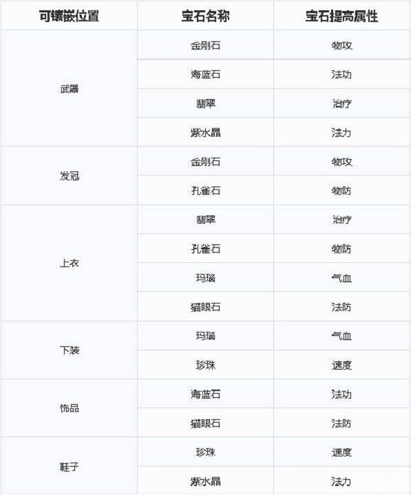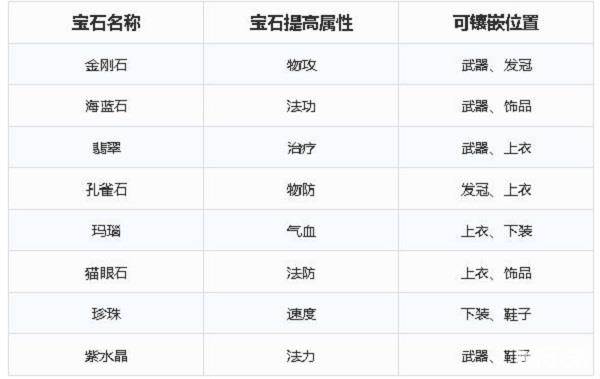 目前游戏内一共有8种宝石,它们分别是金刚石、海蓝石、翡翠、孔雀石、玛瑙、猫眼石、珍珠、紫水晶,其中并没有提高封印强化的宝石。人物装备一共6个部位,它们分别是武器、发冠、上衣、下装、饰品、鞋子。而每个部位能镶嵌的宝石也是有所区别的,具体如下图所示: