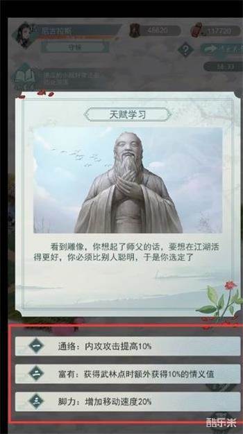 功能:侠道内天赋学习,每次都有三种随机天赋选择,(天赋查看屏幕右下角,天赋页面)
