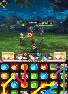 3. 在黄色线火珠连完后,接上的是蓝色线的风珠,在这里把剑珠也连上了(当风珠连完后,剑珠会下滑一格,而剑珠是横向消除一排,能够触发到之前的杖珠,达到2combo)然后接上转珠。