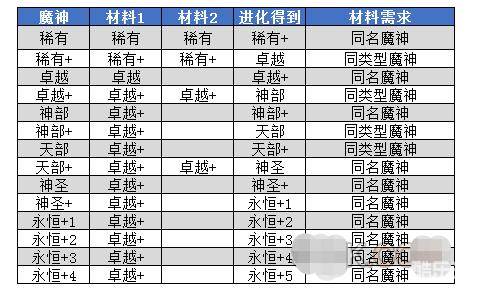 魔神进化时需消耗其他魔神作为材料,从稀有、卓越、神部、天部+、神圣、神圣+、永恒+1、永恒+2、永恒+3、永恒+4进化到下一个品质会消耗同名魔神;从稀有+、卓越+、神部+、天部进化到下一品质可使用同类型魔神作为材料;幻空型魔神只能使用同名魔神进化。