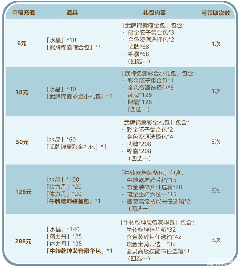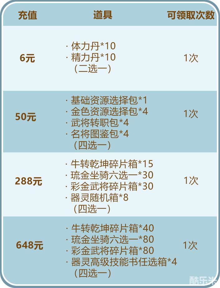 在活动期间,少年们充值将会获得大量珍稀资源,具体奖励如下,少年们可以根据自己缺少的道具来选择档位充值哦~