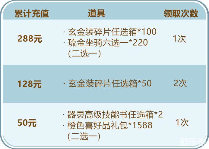 少年们单笔充值指定金额,即可得到玄金装碎片任选箱、琉金坐骑六选一及丰厚的养成资源!少年们千万不要错过哟~