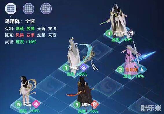 鸟翔阵这套阵法是1号位的角色可以获得20%速度加成,其余角色获得10%速度加成,没有其他的属性加成效果,所以主要是用于在pvp中争夺先手权。