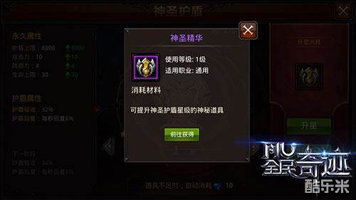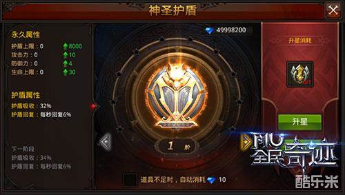 玩家可以通过主界面中的“神圣护盾”入口,进入神圣护盾系统。与翅膀等系统玩法相似,玩家可以通过消耗神圣精华或是钻石对进行护盾升级,从而获得大量的护盾上限、攻击力、防御力、生命上限等属性的提升。在升级的过程中还会产生暴击模式,使得玩家能够快速升级护盾。当玩家护盾升级至十星满星后,则需要消耗一定的神圣晶石进行进阶,从而获得更多的护盾吸收、护盾回复。