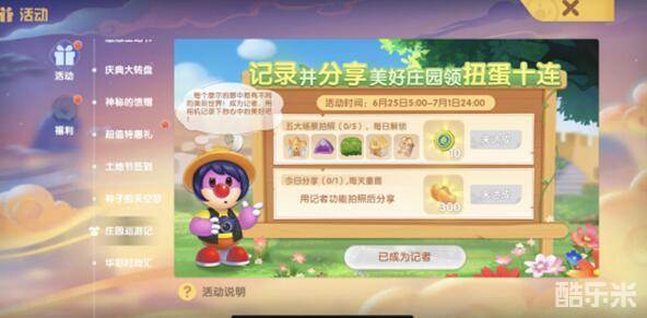 1、这个任务首先需要我们解锁记者职业,点击游戏主界面的活动界面,找到【庄园巡游记】相关的活动之后,点击屏幕左侧的拍摄素材。