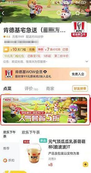 1、在美团或者美团外卖APP中搜索“肯德基宅急送”,之后找到“快乐摩尔,快乐开门”联动活动进入。