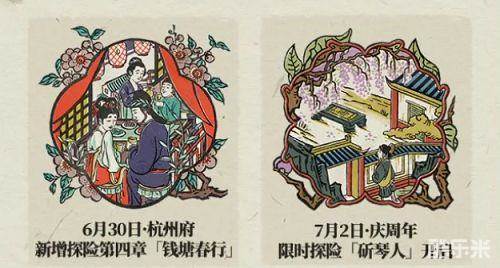 1、6月30日杭州府新增探险第四章钱塘春行,同时在7月2日庆周年限时探险斫琴人开启,届时会有好玩的玩法等待着大家。
