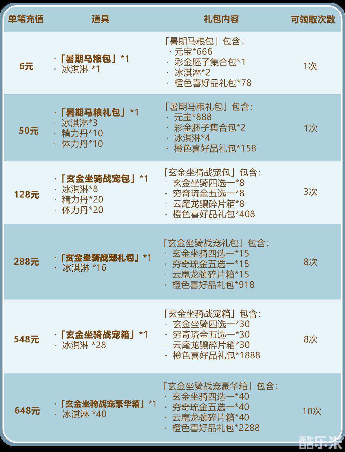 3.「暑期礼盒」可开出:甜筒*111、玄阵养成包*50、觉醒丹*888、天命石*888、极品精炼石*888、安魂石*666、军师列阵包*40、名将图鉴包*40、宝物精炼石*888、甜筒*6、玄阵养成包*5、觉醒丹*100、天命石*100、极品精炼石*22、安魂石*11、军师列阵包*1、名将图鉴包*1、宝物精炼石*60中的随机1种。