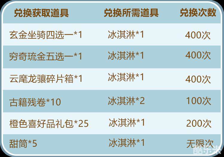 「冰淇淋」可用来兑换玄金坐骑四选一、穷奇琉金五选一、云麾龙骧碎片箱等稀有资源: