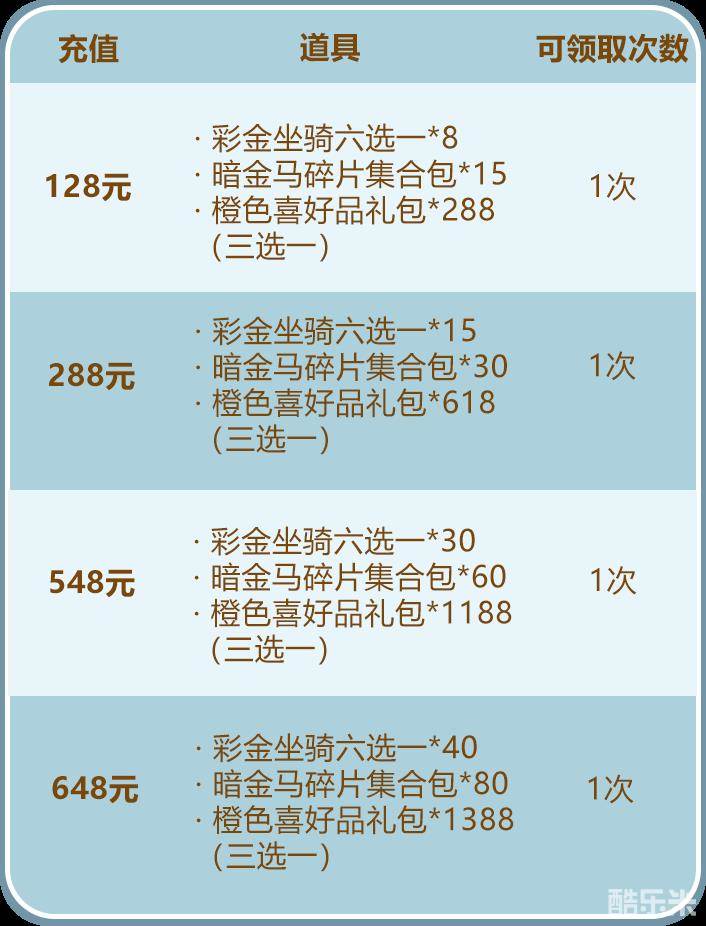 在活动期间少年们单笔充值至指定金额,即可获得玄金坐骑四选一、穷奇琉金五选一、云麾龙骧碎片箱、橙色喜好品礼包、冰淇淋等资源: