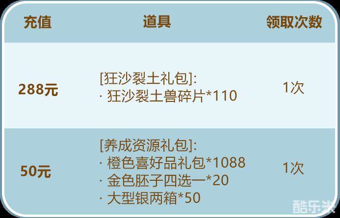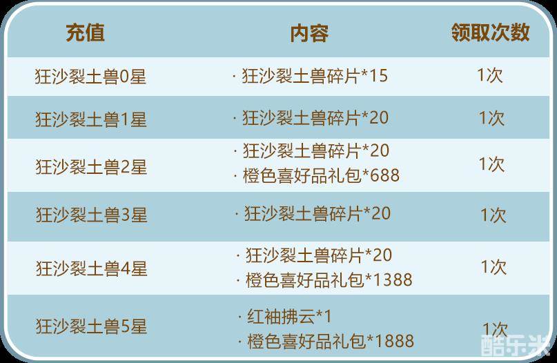 少年们单笔充值指定金额,即可得到狂沙裂土兽碎片及丰厚的养成资源!少年们千万不要错过哟~