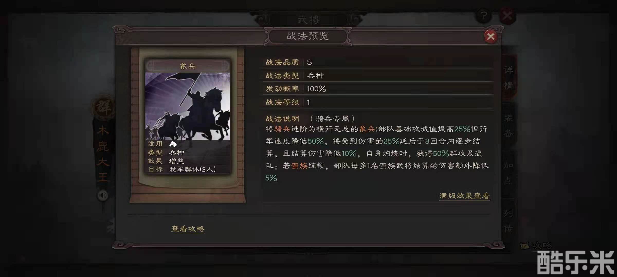 象兵是属于南蛮武将木鹿大王的自带战法,效果是将骑兵部队进化为象兵,可以提升部队的攻城值,但是会额外降低部队的行军速度。战斗中受到的伤害可以延迟三个回合结算,而且在结算的时候降低10%受到的伤害值。如果遇到灼烧效果的话,会额外被混乱影响,如果是队伍中蛮族武将多的话,伤害还能继续降低。