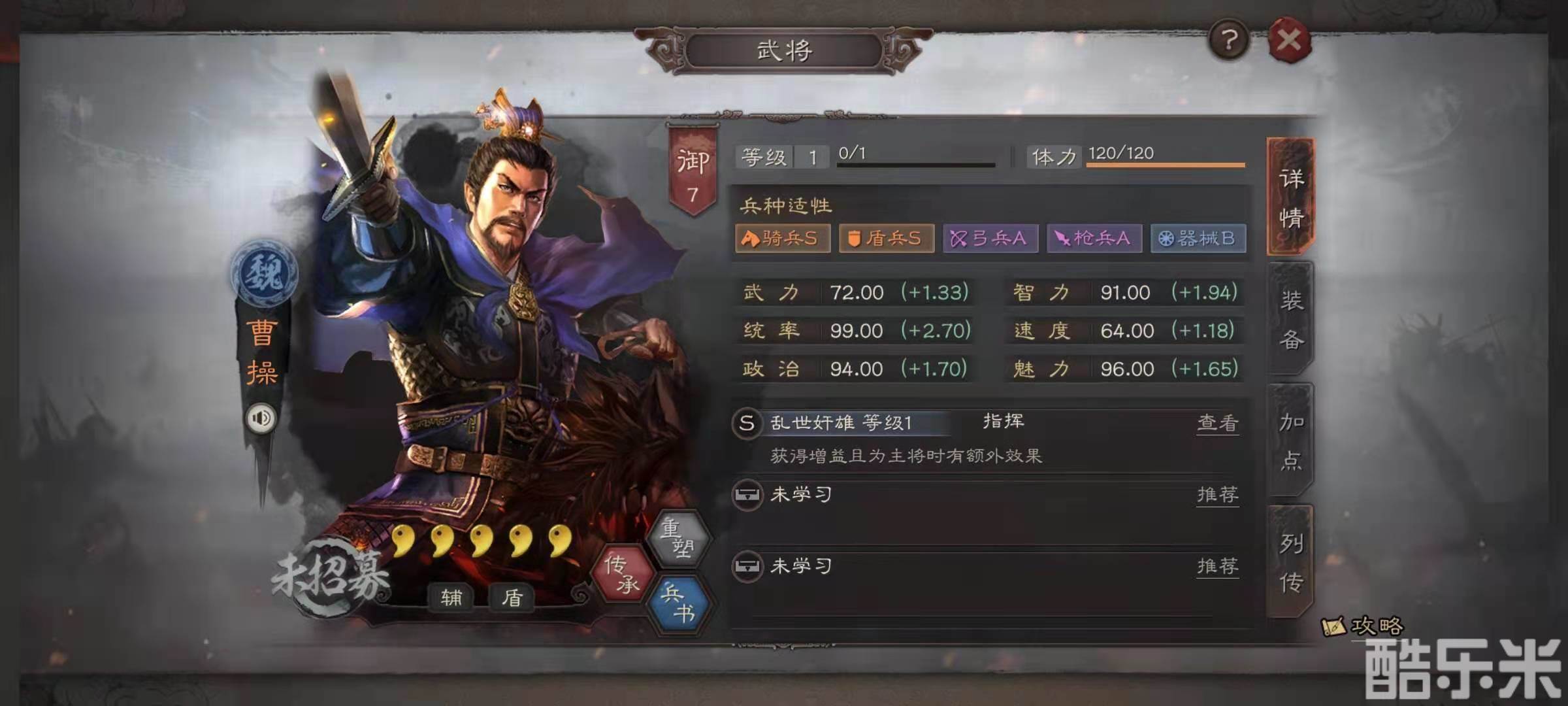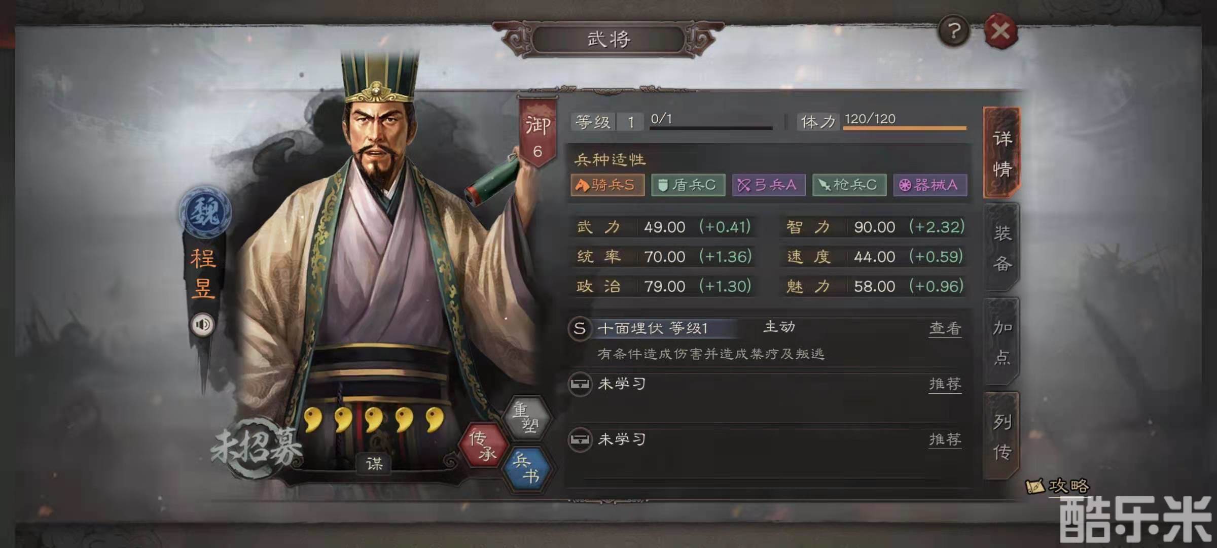 蛮族武将中,祝融夫人,兀突骨和木鹿大王的骑兵属性都是S,但是这些武将组合在一起有些不伦不类,完全为了减伤也是得不偿失。所以小编选择的是放弃蛮族武将,选择魏国的谋略骑兵组合,武将搭配是曹操,贾诩和程昱。其中曹操的自带战法效果是非常优秀的辅助技能,可以提升副将伤害和自身的防御力,象兵本身的防御力就比较强势,加上曹操的辅助,完全可以硬钢。