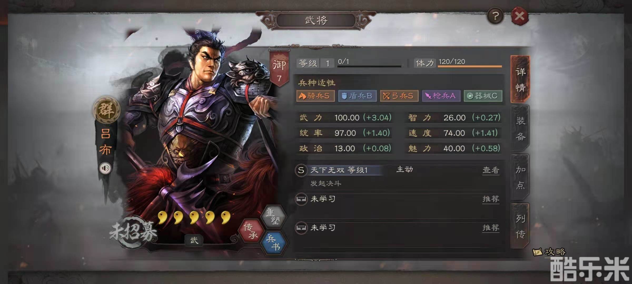 战法天下无双可以强制敌方决斗,在决斗中其他武将都是打不过吕布的,每次决斗都可以打到半血。因为吕布的这个技能是自带主动战法,享受三势阵的提升概率加成。但是吕布作为核心是不能学习三势阵的,吕布需要搭配的技能是鬼神霆威和一骑当千,这两个技能一个是群体伤害,一个是单体伤害,正好互补。