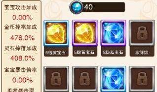 宝石总共分5种,分别是蓝、绿、红、紫、黄,每种宝石都拥有不同的属性加成。绿色宝石属性是让宝宝攻击伤害值+10%;蓝色宝石是击杀BOSS获得灵石比例增加;黄色宝石是击杀普通怪获得金币比例增加;紫色宝石是让暴击伤害加倍;红色宝石这是让勇者的暴击率增加。